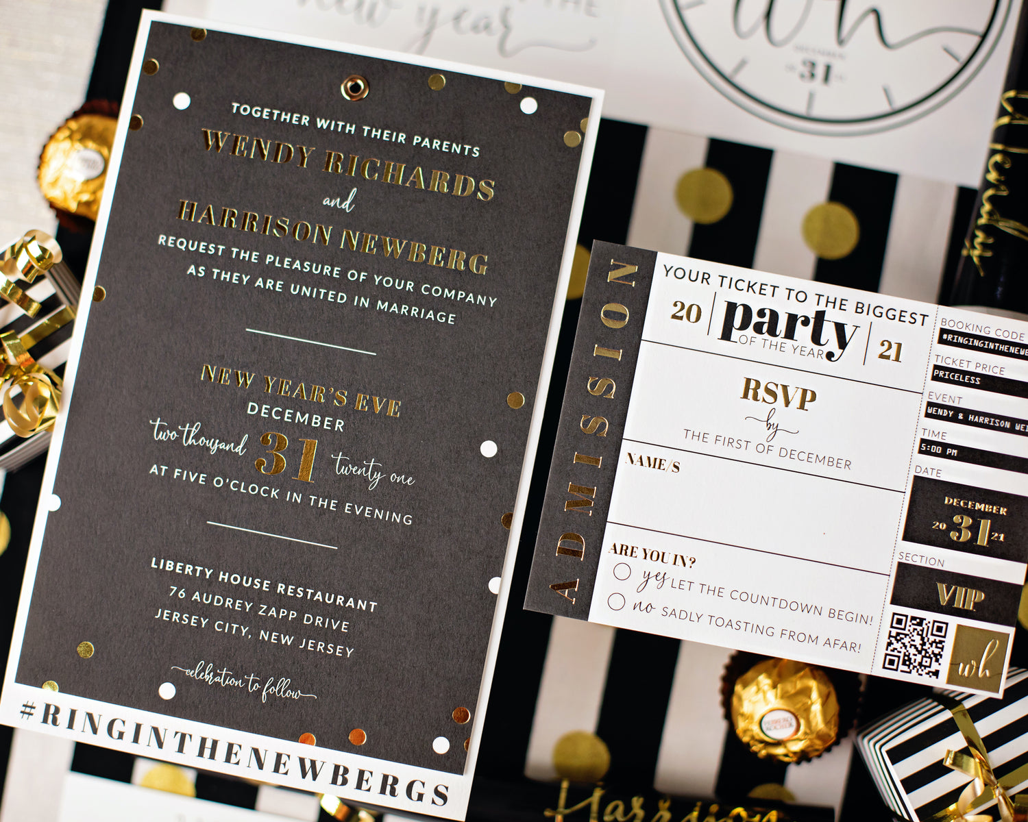 A New Year's Eve wedding themed collection featuring a Black, Gold and White...