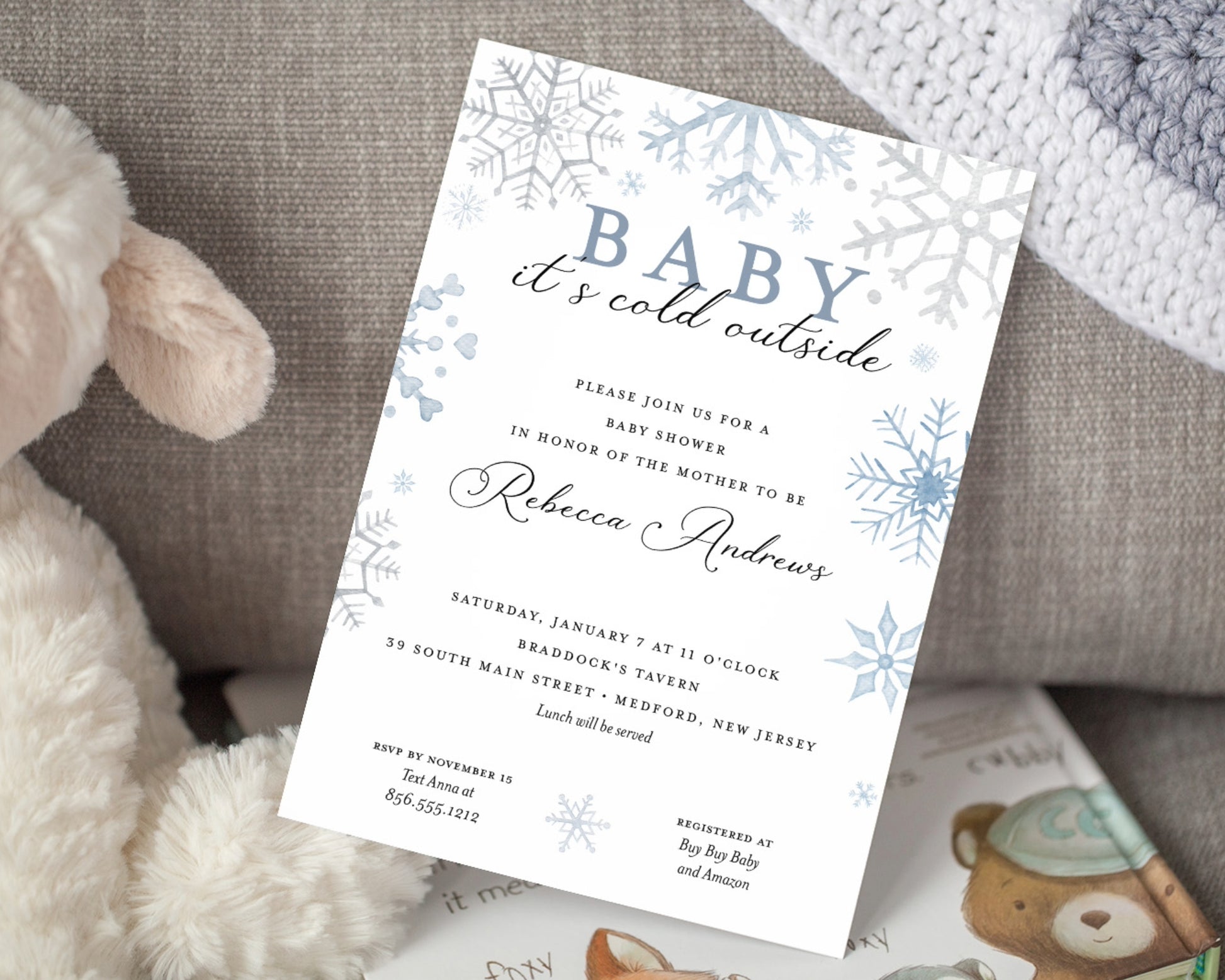 Welcome your mini blizzard on the horizon with a winter wonderland themed baby shower! This baby shower invitation is the perfect way to say "Let's party!" to your loved ones. Watercolor snowflake graphics will be sure to set the mood for a delightful get-together.