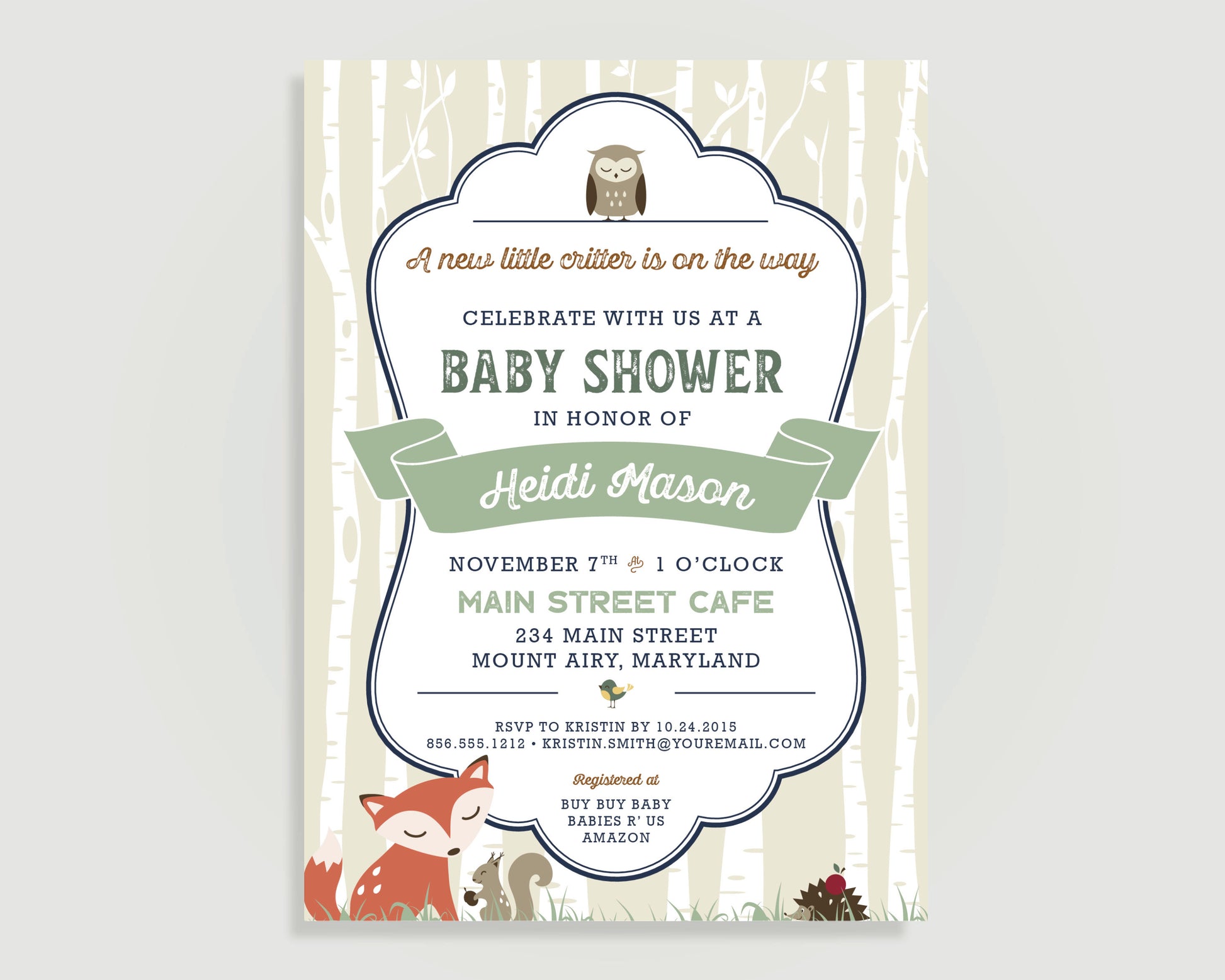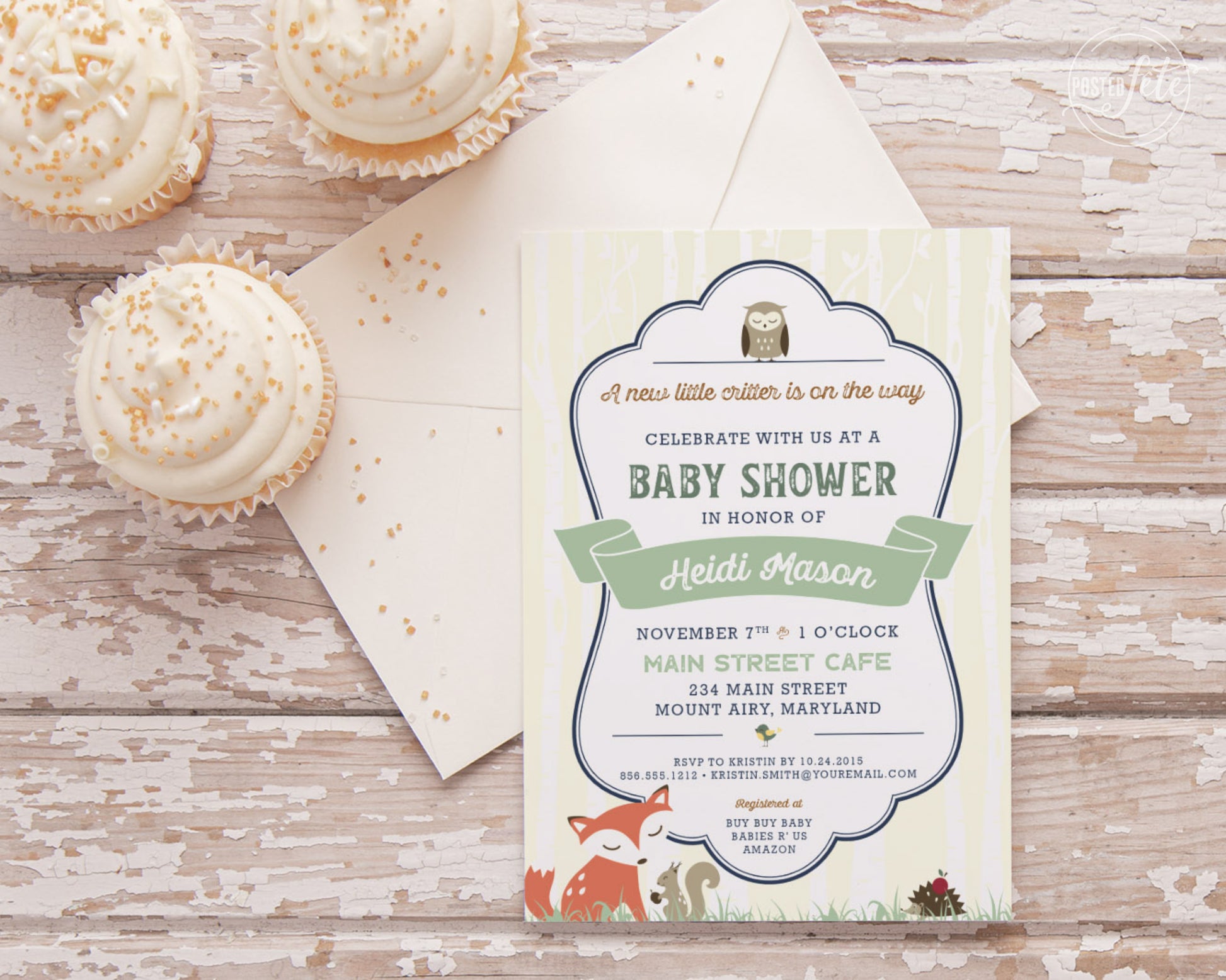 Celebrate the little critter on the way with a a woodland creature baby shower invitation personalized for your unique style.