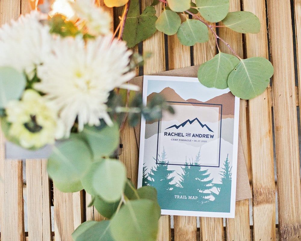 A camp wedding themed collection featuring a trail map invitation, mountain monogram and mountain themed stationery. The collection...